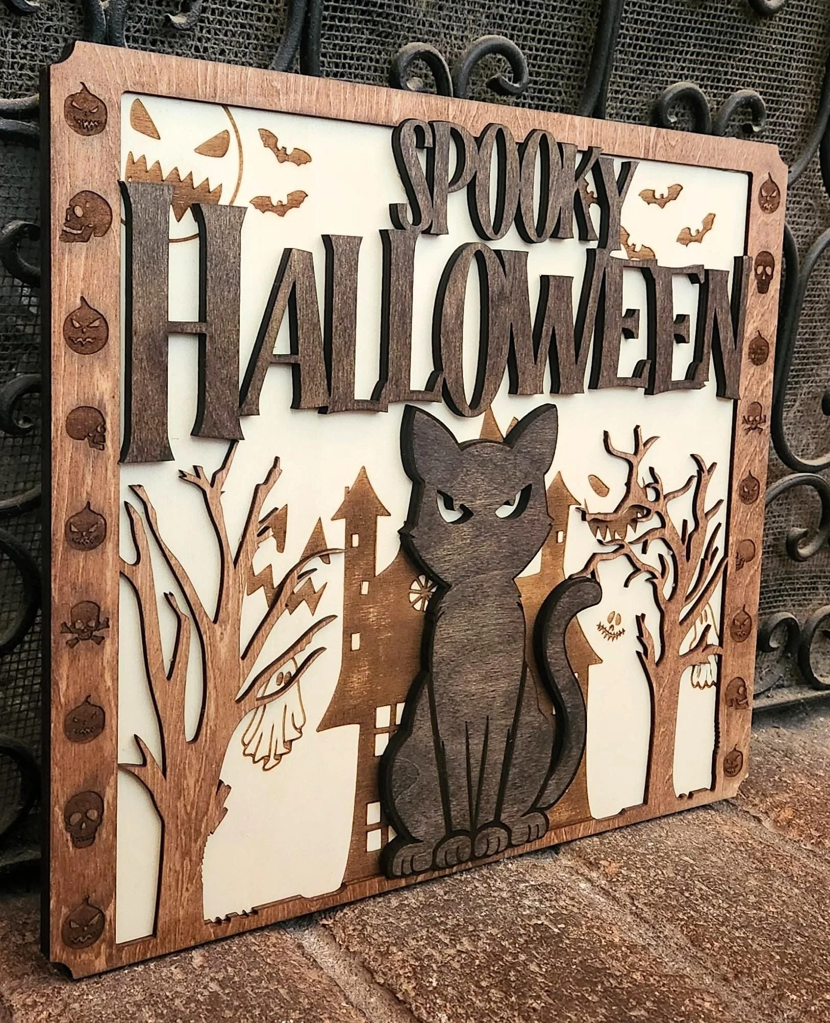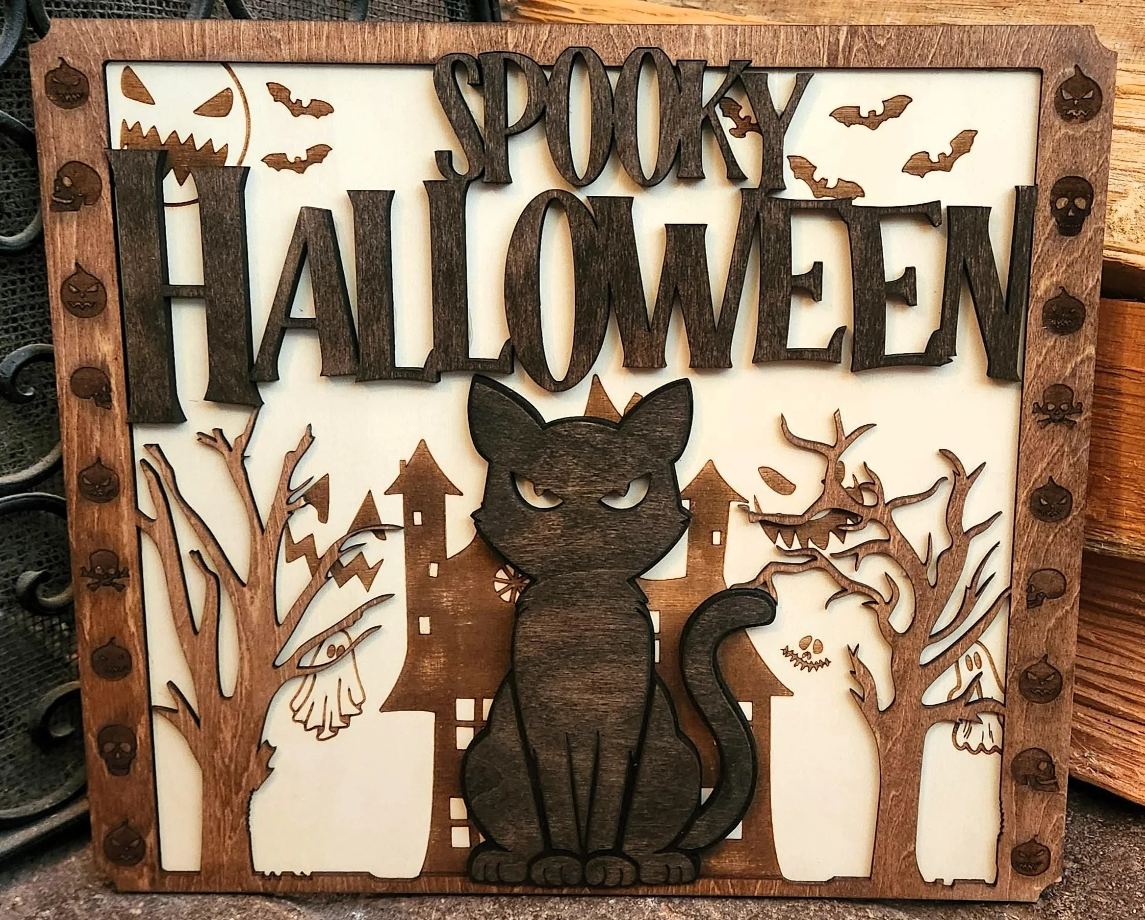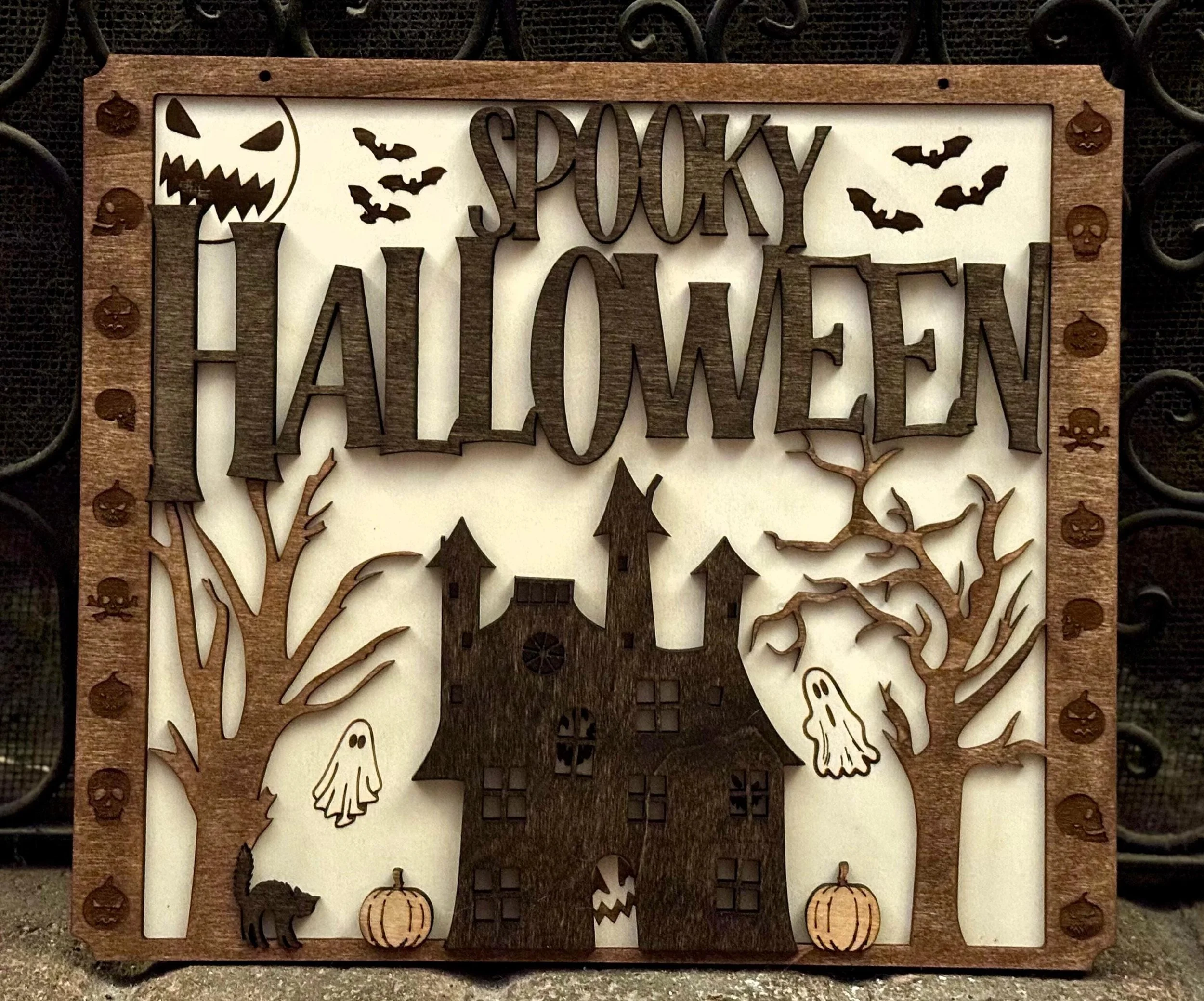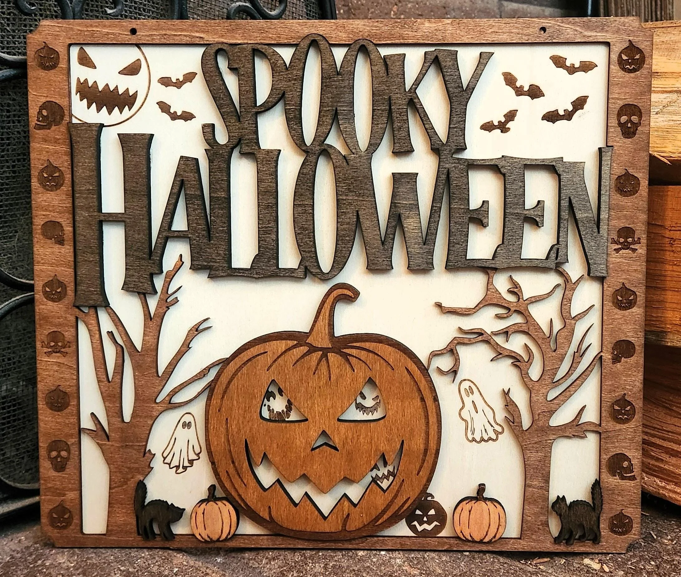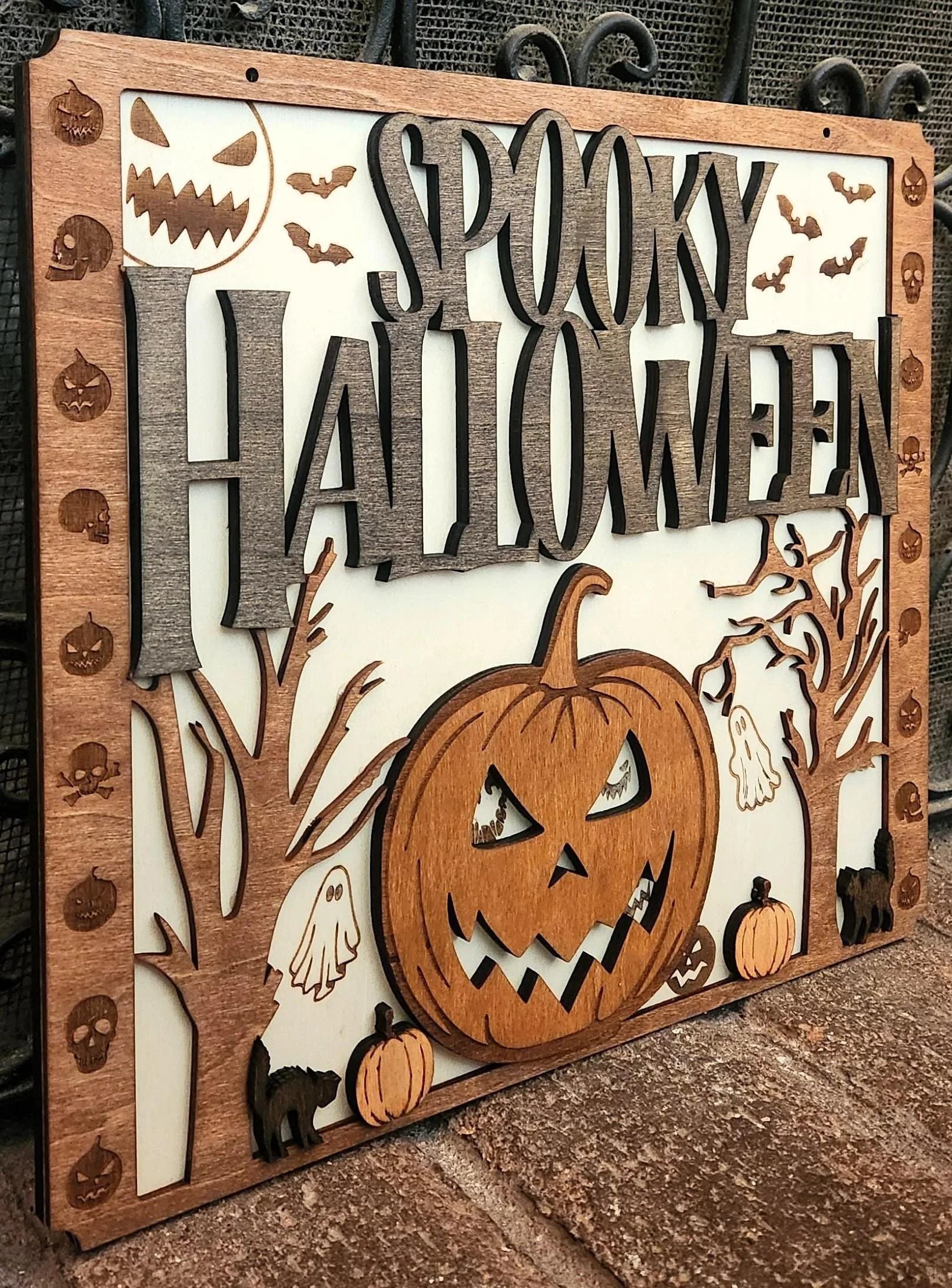 Halloween Sign – Wall or Shelf Decor Bring a festive touch to your space with this charming Halloween sign! Measuring 12 inches tall and 13.5 inches wide, it’s the perfect size to make a statement without taking up too much space.